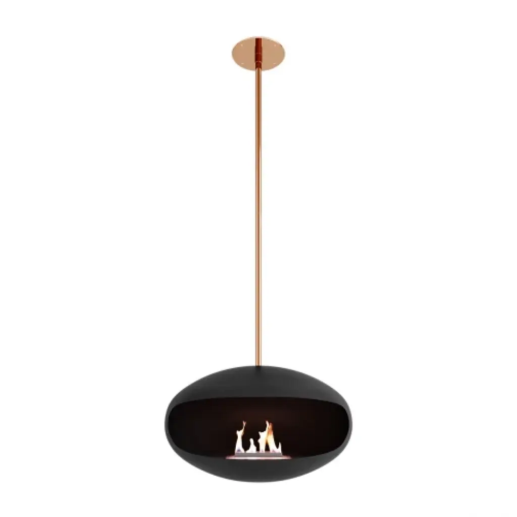 The Cocoon Fires Aeris with matte black shell and copper pole is a luxurious ceiling-suspended bioethanol fireplace, blending contemporary elegance with advanced functionality. Designed by Federico Otero, this fireplace delivers a clean, flue-free flame while serving as a sculptural centrepiece for modern interiors. The striking black-and-copper finish adds warmth and sophistication to living spaces, dining areas, and open-plan environments.